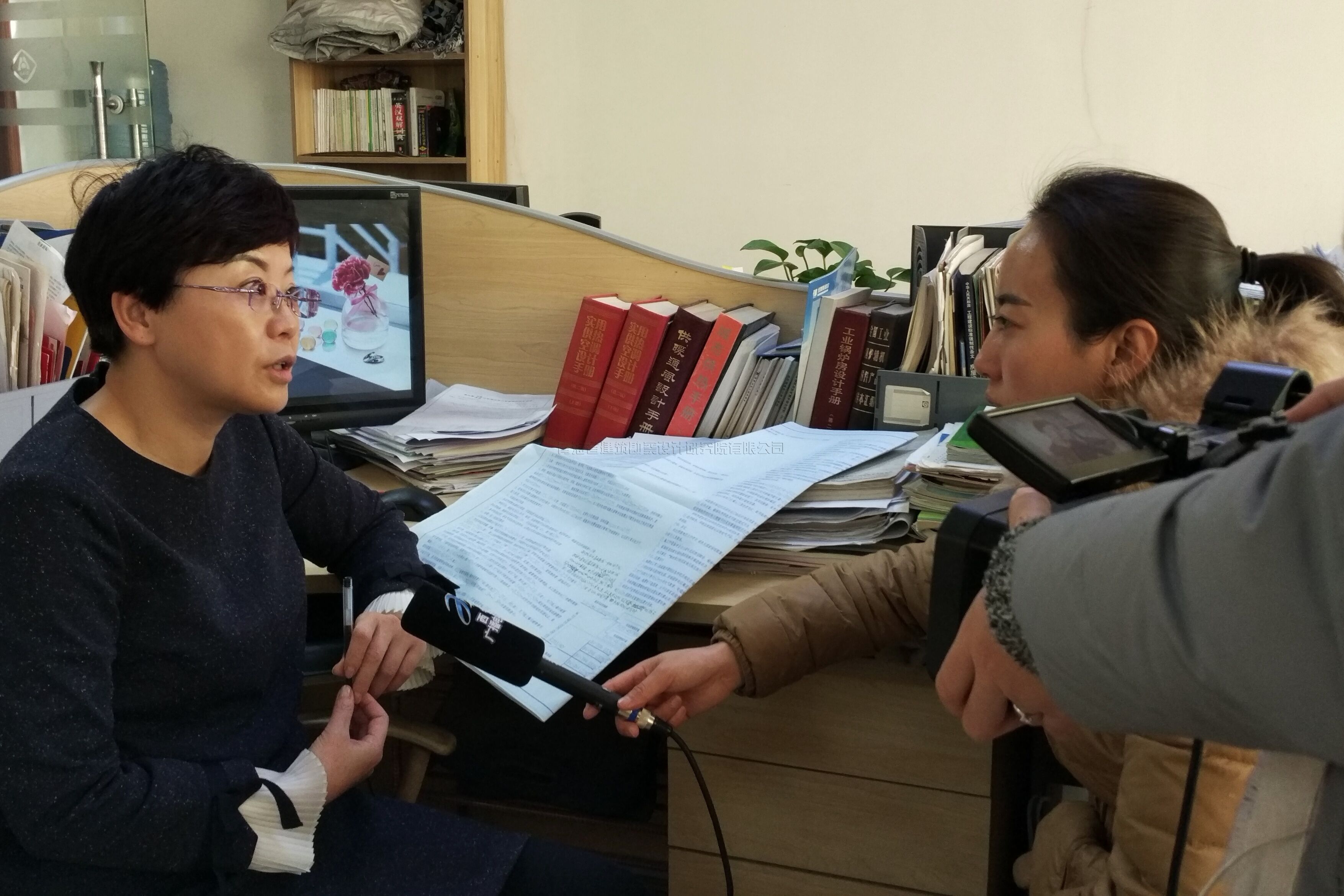 專訪結(jié)束后,記者錄拍了貴賓廳陳列的一些公司獲得了重要榮譽牌匾。接著,在公司工作人員的引導(dǎo)下,到各設(shè)計所了解一線人員的工作情況,并對設(shè)計二所技術(shù)人員王麗華高級工程師進行了簡短采訪,王麗華同志從電氣設(shè)計角度談了“誠信是社會效益的重要組成部分,只有以甲方的合理需求為出發(fā)點,嚴格按設(shè)計規(guī)范誠信設(shè)計,才能求得企業(yè)的長遠發(fā)展”。記者隨后又來到設(shè)計四所,公司監(jiān)事會主席、四所所長于俊江和所設(shè)計人員正在討論一些設(shè)計問題,記者拍攝了一些他們一起忙碌的工作畫面。