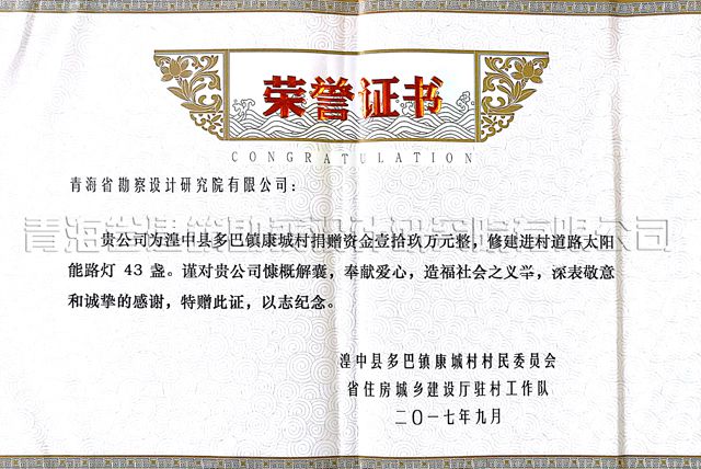 2017年10月26日,湟中縣多巴鎮(zhèn)康城村村民委員會頒給公司一塊獎牌和一本榮譽(yù)證書。獎牌上“情系鄉(xiāng)村真奉獻(xiàn),村莊舊貌換新顏”的十四個紅紅的大字顯得十分醒目?!百F公司為湟中縣多巴鎮(zhèn)康城村捐贈資金壹拾玖萬元整,修建進(jìn)村道路太陽能路燈43盞。謹(jǐn)對貴公司慷慨解囊、奉獻(xiàn)愛心,造福社會之義舉,深表敬意和誠摯的感謝。特贈此證,以志紀(jì)念”,榮譽(yù)證書上暖暖的一番話,記錄了公司對聯(lián)點(diǎn)幫扶村——康城村的真幫扶和真愛心,也表達(dá)了康城村村民對公司的一片感恩之情。