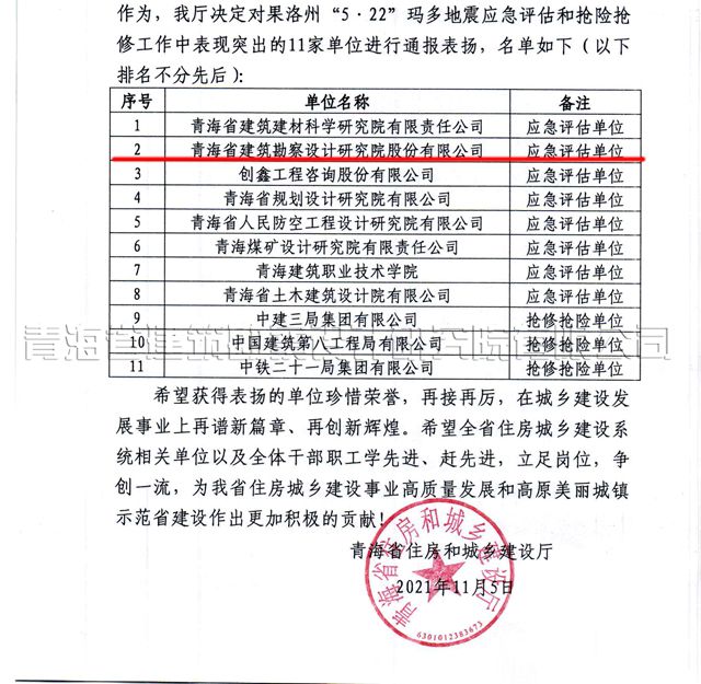 近日,青海省住建廳下發(fā)青建設(shè)[2021] 317號文件,對在果洛州“5. 22”瑪多地震抗震救災工作中表現(xiàn)突出的11家單位和企業(yè)進行表揚通報,我公司在表揚通報之列。